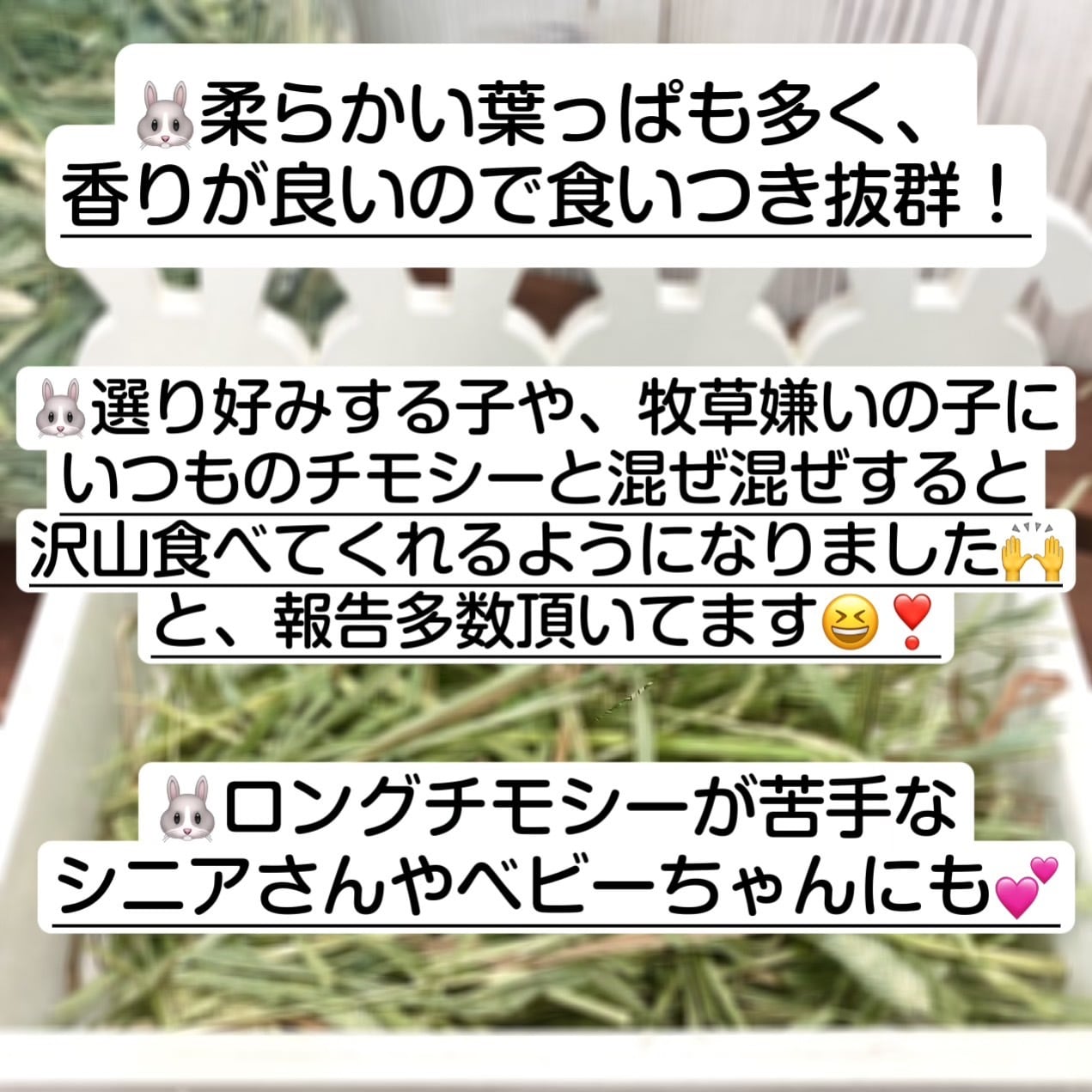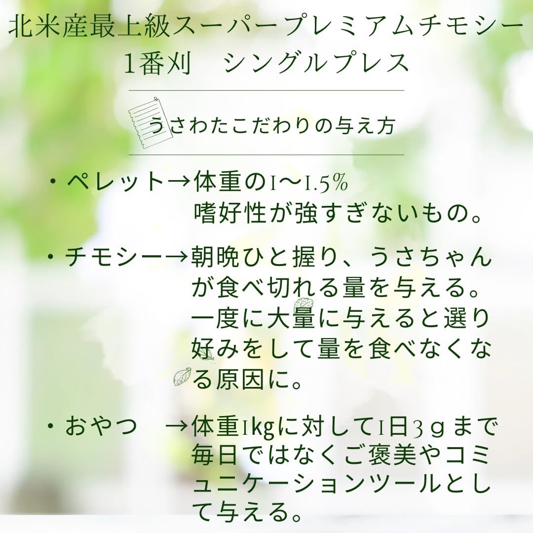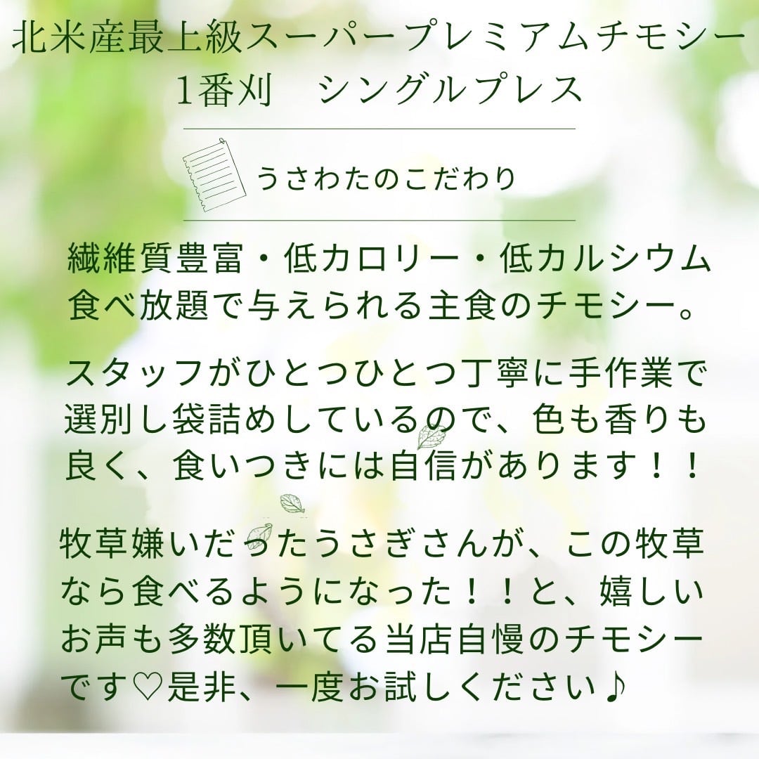 ・うさわたのチモシーを選別する際に出る短いものや柔らかい葉っぱ部分で、品質はいつものチモシーと同じ繊維質豊富な1番刈りのシングルプレス。ソフトチモシーや二番刈り三番刈りしか食べずうんちがちっちゃい…って子は絶対試すべし❣️です☆